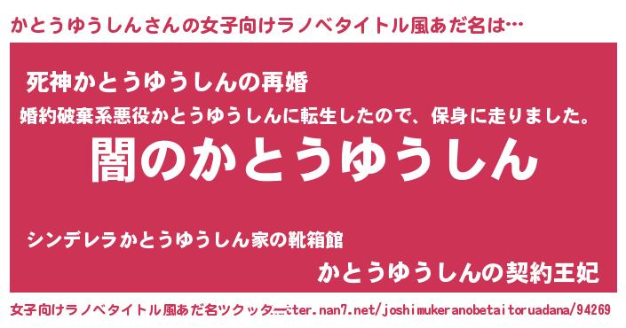 | 男性向けラノベタイトル風あだ名 | 『Re:かとうゆうしんから始める異世界生活』 |