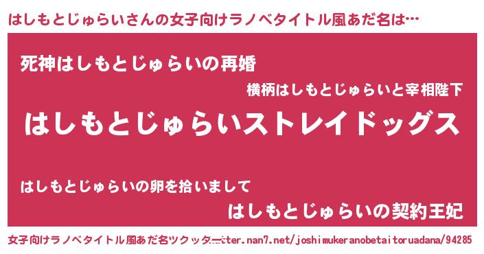 | 男性向けラノベタイトル風あだ名 | 『Re:はしもとじゅらいから始める異世界生活』 |