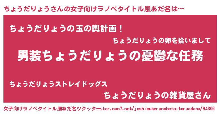 | 男性向けラノベタイトル風あだ名 | 『うちのちょうだりょうが世界を掌握している!』 |