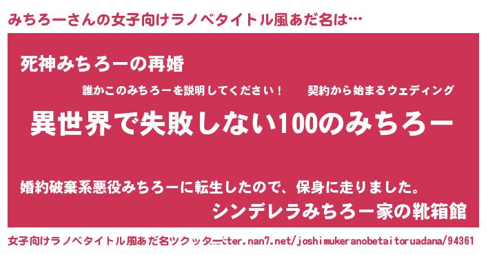 みちろーさんの女子向けラノベタイトル風あだ名は… 『異世界で失敗しない100のみちろー』『死神みちろーの再婚』『シンデレラみちろー家の靴箱館』 ツクッター #女子向けラノベタイトル風あだ名ツクッター http://tkutter.nan7.net/joshimukeranobetaitoruadana/94361/