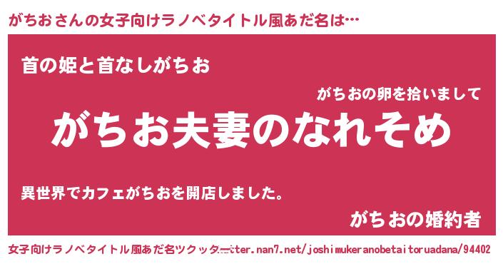 | 男性向けラノベタイトル風あだ名 | 『おまえをオタクにしてやるから、俺をがちおにしてくれ! 』 |