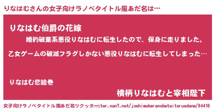 | 男性向けラノベタイトル風あだ名 | 『この素晴らしい世界にりなはむを!』 |