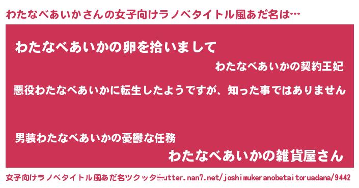 | 男性向けラノベタイトル風あだ名 | 『この素晴らしい世界にわたなべあいかを!』 |