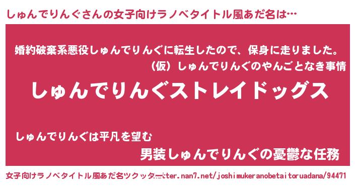 | 男性向けラノベタイトル風あだ名 | 『Re:しゅんでりんぐから始める異世界生活』 |
