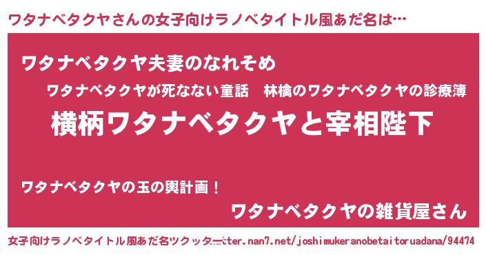 | 男性向けラノベタイトル風あだ名 | 『ワタナベタクヤに滅ぼされるだけの簡単なお仕事です』 |