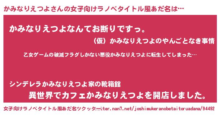 | 胡散臭い通販商品みたいなあだ名 | 『世界中を虜にした100年もののヴィンテージワイン…その名も「かみなりえつよ」』 |