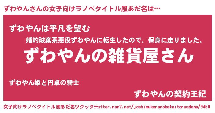 | 男性向けラノベタイトル風あだ名 | 『やはりずわやんの青春ラブコメはまちがっている 』 |