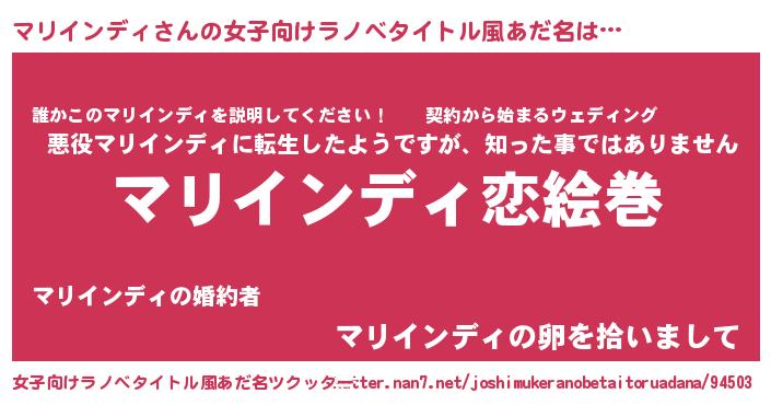 | 男性向けラノベタイトル風あだ名 | 『おまえをオタクにしてやるから、俺をマリインディにしてくれ! 』 |