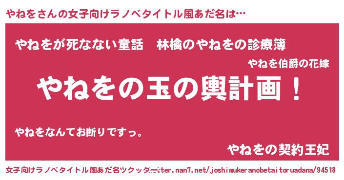 | 男性向けラノベタイトル風あだ名 | 『やねを~年齢イコール彼女いない歴の魔法使い~』 |