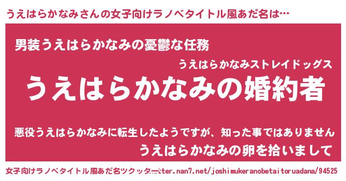 | 男性向けラノベタイトル風あだ名 | 『うちの娘の為ならば、俺はもしかしたらうえはらかなみも倒せるかもしれない。』 |