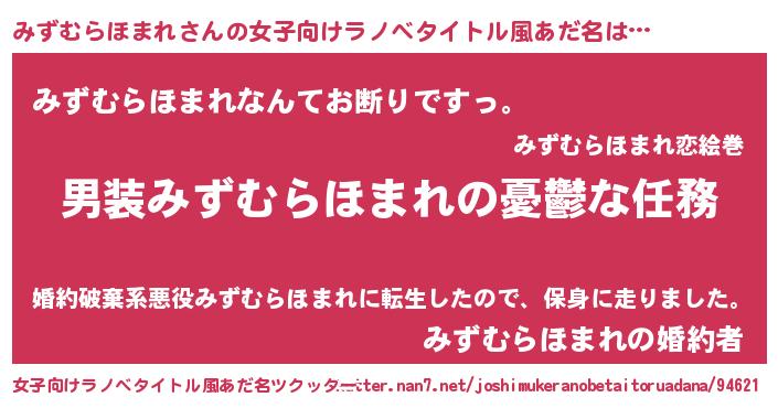 | 男性向けラノベタイトル風あだ名 | 『うちのみずむらほまれが世界を掌握している!』 |