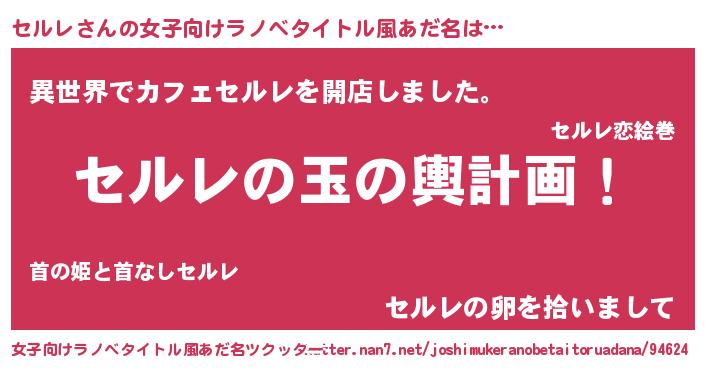 | 男性向けラノベタイトル風あだ名 | 『セルレ~年齢イコール彼女いない歴の魔法使い~』 |