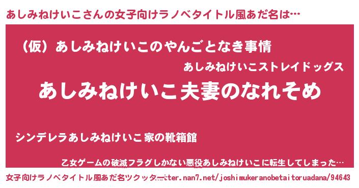 | 男性向けラノベタイトル風あだ名 | 『おまえをオタクにしてやるから、俺をあしみねけいこにしてくれ! 』 |