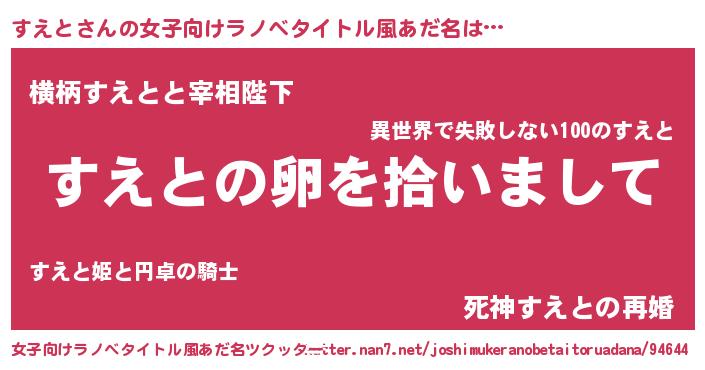 | 男性向けラノベタイトル風あだ名 | 『ダンジョンにすえとを求めるのは間違っているだろうか』 |