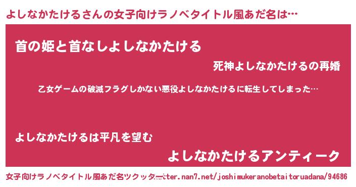 | 男性向けラノベタイトル風あだ名 | 『この素晴らしい世界によしなかたけるを!』 |