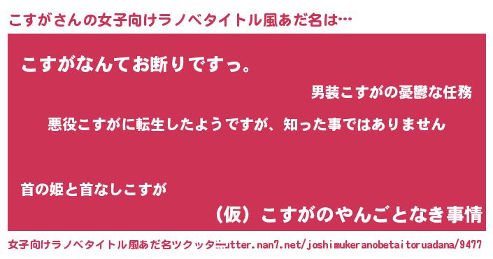 | 男性向けラノベタイトル風あだ名 | 『この素晴らしい世界にこすがを!』 |