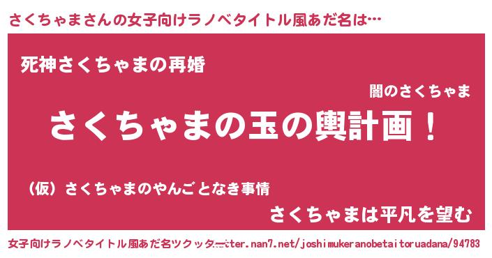 | 男性向けラノベタイトル風あだ名 | 『さくちゃま~年齢イコール彼女いない歴の魔法使い~』 |