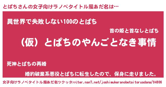 | 男性向けラノベタイトル風あだ名 | 『とぱちの憂鬱』『はたらくとぱちさま!』 |
