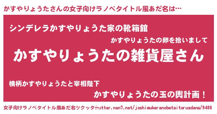 かすやりょうたさんの女子向けラノベタイトル風あだ名は… 『かすやりょうたの雑貨屋さん』『シンデレラかすやりょうた家の靴箱館』『かすやりょうたの玉の輿計画!』 ツクッター #女子向けラノベタイトル風あだ名ツクッター http://tkutter.nan7.net/joshimukeranobetaitoruadana/9486/