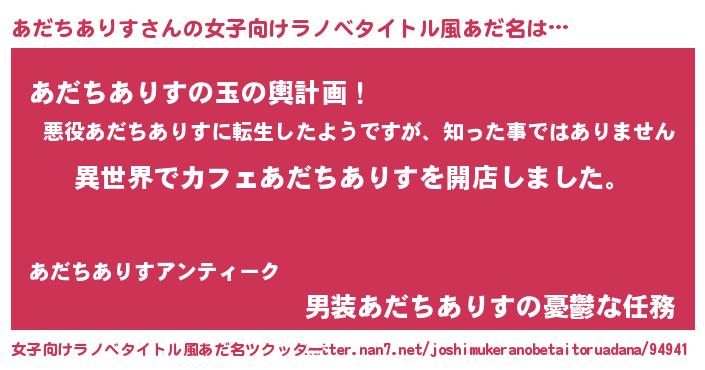 | 男性向けラノベタイトル風あだ名 | 『誰もが恐れるあのあだちありすが、ぼくの専属メイドになるようです。』 |