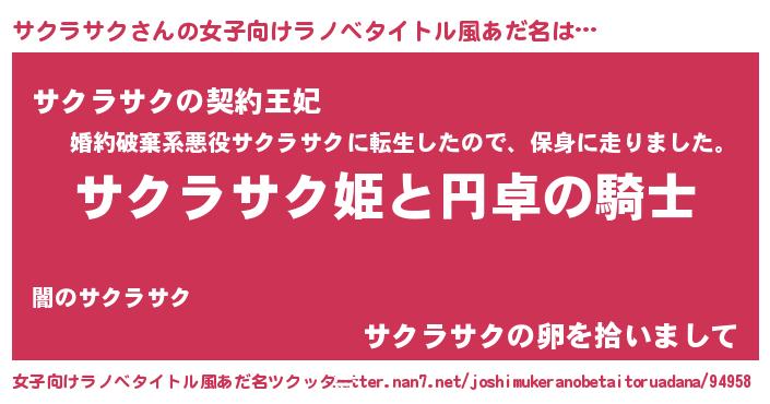 サクラサクさんの女子向けラノベタイトル風あだ名は… 『サクラサク姫と円卓の騎士』『サクラサクの契約王妃』『サクラサクの卵を拾いまして』 ツクッター #女子向けラノベタイトル風あだ名ツクッター http://tkutter.nan7.net/joshimukeranobetaitoruadana/94958/