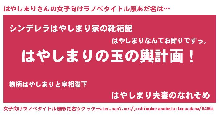 はやしまりさんの女子向けラノベタイトル風あだ名は… 『はやしまりの玉の輿計画!』『シンデレラはやしまり家の靴箱館』『はやしまり夫妻のなれそめ』 ツクッター #女子向けラノベタイトル風あだ名ツクッター http://tkutter.nan7.net/joshimukeranobetaitoruadana/94965/