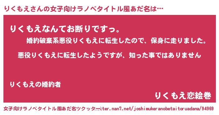 りくもえさんの女子向けラノベタイトル風あだ名は… 『悪役りくもえに転生したようですが、知った事ではありません』『りくもえなんてお断りですっ。』『りくもえ恋絵巻』 ツクッター #女子向けラノベタイトル風あだ名ツクッター http://tkutter.nan7.net/joshimukeranobetaitoruadana/94969/