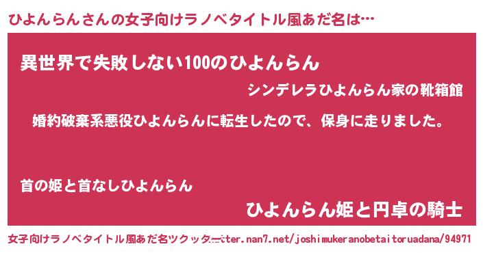 | 男性向けラノベタイトル風あだ名 | 『ヒヨンランスレイヤー』 |