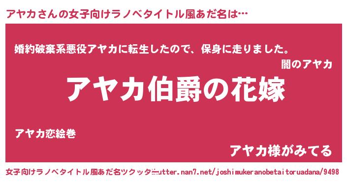 | 男性向けラノベタイトル風あだ名 | 『やはりアヤカの青春ラブコメはまちがっている 』 |