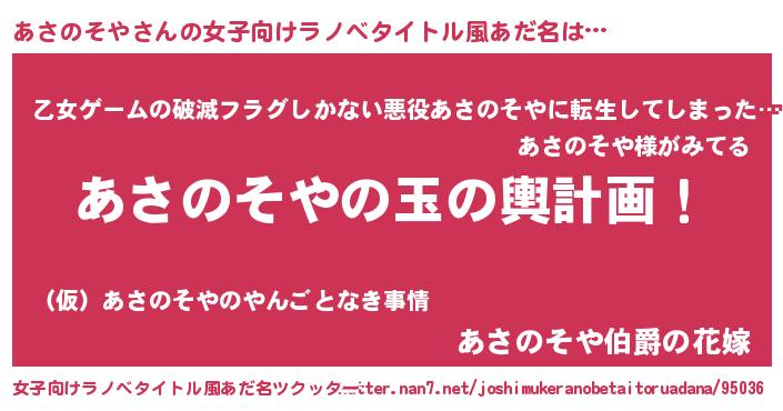 | 男性向けラノベタイトル風あだ名 | 『あさのそや~年齢イコール彼女いない歴の魔法使い~』 |
