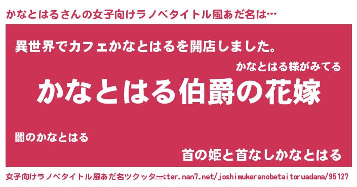| 男性向けラノベタイトル風あだ名 | 『うちの娘の為ならば、俺はもしかしたらかなとはるも倒せるかもしれない。』 |