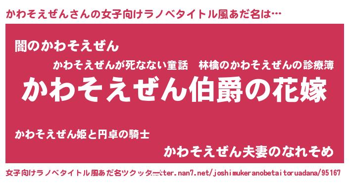 かわそえぜんさんの女子向けラノベタイトル風あだ名は… 『かわそえぜん伯爵の花嫁』『闇のかわそえぜん』『かわそえぜん夫妻のなれそめ』 ツクッター #女子向けラノベタイトル風あだ名ツクッター http://tkutter.nan7.net/joshimukeranobetaitoruadana/95167/