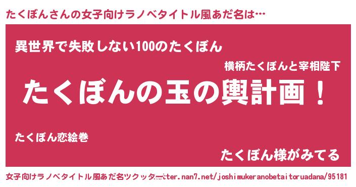 | 男性向けラノベタイトル風あだ名 | 『たくぼん~年齢イコール彼女いない歴の魔法使い~』 |