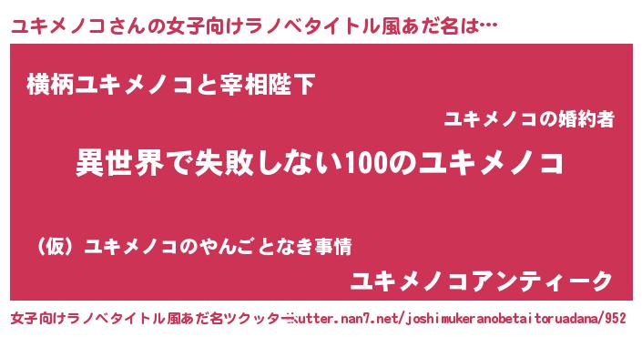 ユキメノコさんの女子向けラノベタイトル風あだ名は… 『異世界で失敗しない100のユキメノコ』『横柄ユキメノコと宰相陛下』『ユキメノコアンティーク』 ツクッター #女子向けラノベタイトル風あだ名ツクッター http://tkutter.nan7.net/joshimukeranobetaitoruadana/952/
