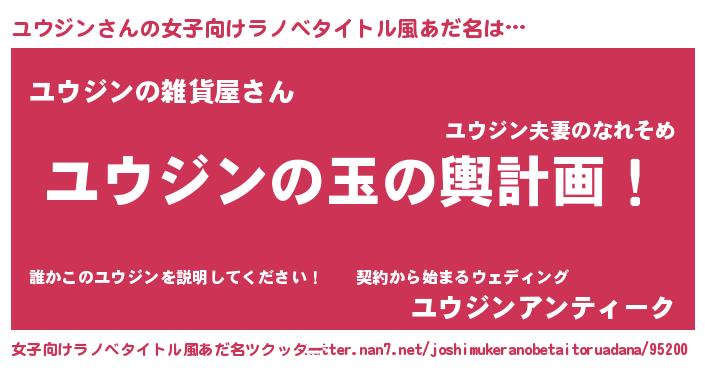 | 男性向けラノベタイトル風あだ名 | 『ユウジン~年齢イコール彼女いない歴の魔法使い~』 |