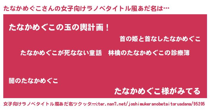 | 男性向けラノベタイトル風あだ名 | 『魔弾の王とたなかめぐこ』 |