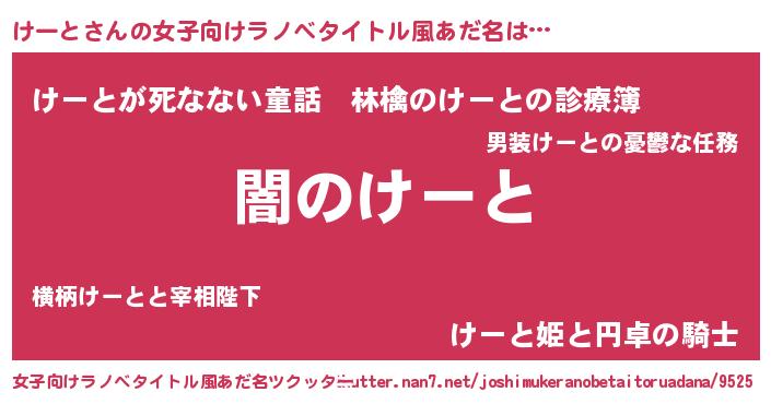 | 男性向けラノベタイトル風あだ名 | 『Re:けーとから始める異世界生活』 |