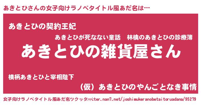 | 男性向けラノベタイトル風あだ名 | 『やはりあきとひの青春ラブコメはまちがっている 』 |