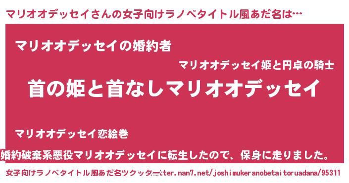 マリオオデッセイさんの女子向けラノベタイトル風あだ名は… 『首の姫と首なしマリオオデッセイ』『マリオオデッセイの婚約者』『婚約破棄系悪役マリオオデッセイに転生したので、保身に走りました。』 ツクッター #女子向けラノベタイトル風あだ名ツクッター http://tkutter.nan7.net/joshimukeranobetaitoruadana/95311/
