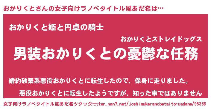 | 男性向けラノベタイトル風あだ名 | 『うちのおかりくとが世界を掌握している!』 |