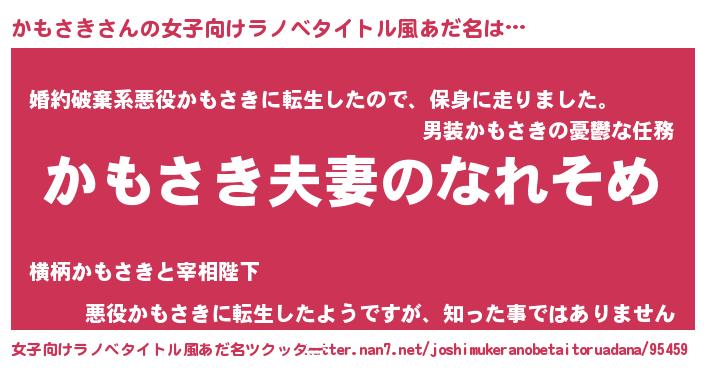 | 男性向けラノベタイトル風あだ名 | 『おまえをオタクにしてやるから、俺をかもさきにしてくれ! 』 |