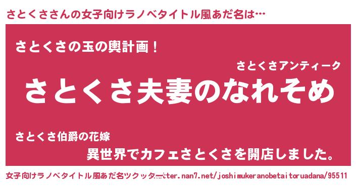 | 男性向けラノベタイトル風あだ名 | 『おまえをオタクにしてやるから、俺をさとくさにしてくれ! 』 |