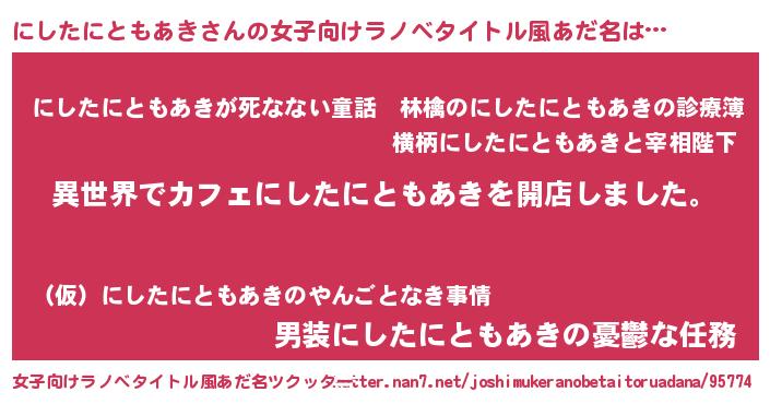 | ヘコむあだ名 | 『にしたにともあき(遠い目)』『にしもー』 |