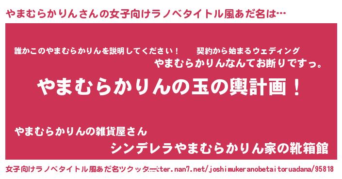 | 男性向けラノベタイトル風あだ名 | 『やまむらかりん~年齢イコール彼女いない歴の魔法使い~』 |