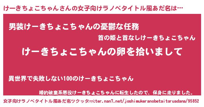 | 男性向けラノベタイトル風あだ名 | 『ダンジョンにけーきちょこちゃんを求めるのは間違っているだろうか』 |