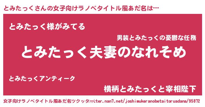| 男性向けラノベタイトル風あだ名 | 『おまえをオタクにしてやるから、俺をとみたっくにしてくれ! 』 |