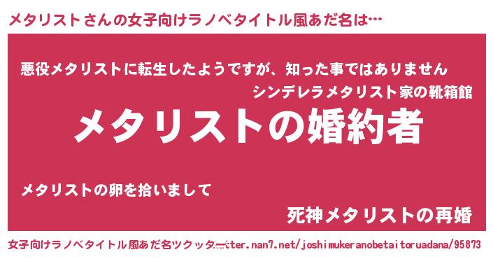 メタリストさんの女子向けラノベタイトル風あだ名は… 『メタリストの婚約者』『悪役メタリストに転生したようですが、知った事ではありません』『死神メタリストの再婚』 ツクッター #女子向けラノベタイトル風あだ名ツクッター http://tkutter.nan7.net/joshimukeranobetaitoruadana/95873/
