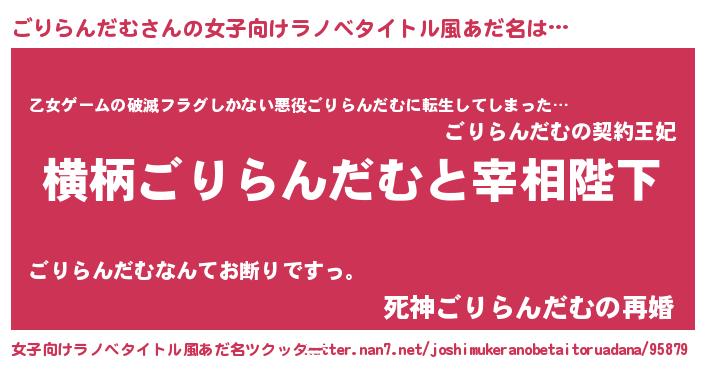 | 男性向けラノベタイトル風あだ名 | 『ごりらんだむに滅ぼされるだけの簡単なお仕事です』 |