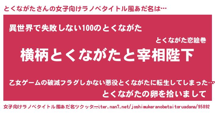 | 男性向けラノベタイトル風あだ名 | 『とくながたに滅ぼされるだけの簡単なお仕事です』 |