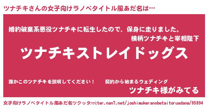 | 男性向けラノベタイトル風あだ名 | 『Re:ツナチキから始める異世界生活』 |
